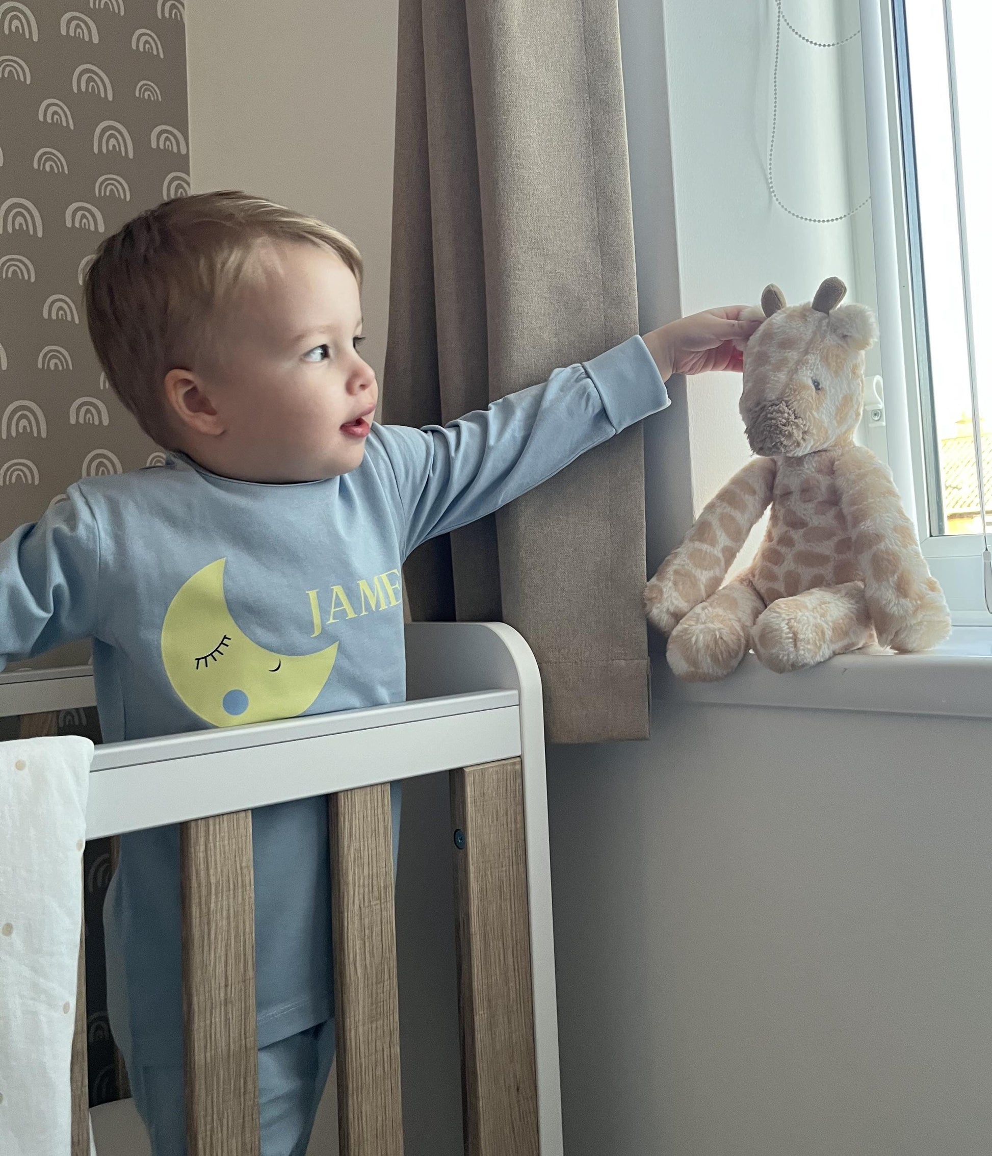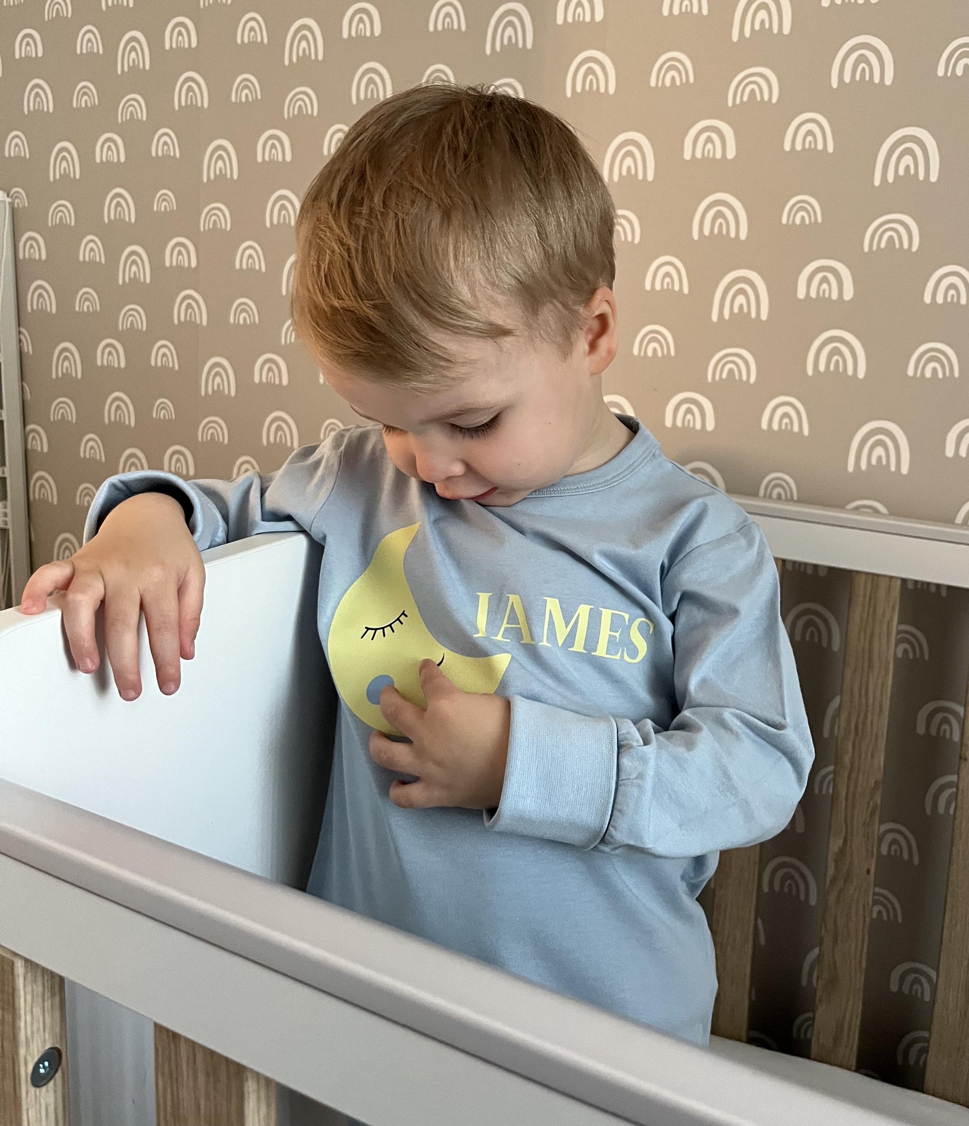 Snuggle your little one into sweet dreams with our personalised baby pyjamas! These are soft, cosy and 100% organic cotton. The pyjamas feature your baby's name printed alongside an adorable design of a sleepy moon. Perfect for bedtime or as a cherished keepsake, this personalised touch makes it truly one of a kind. Ideal for gifting or creating treasured memories that you'll hold onto forever!
