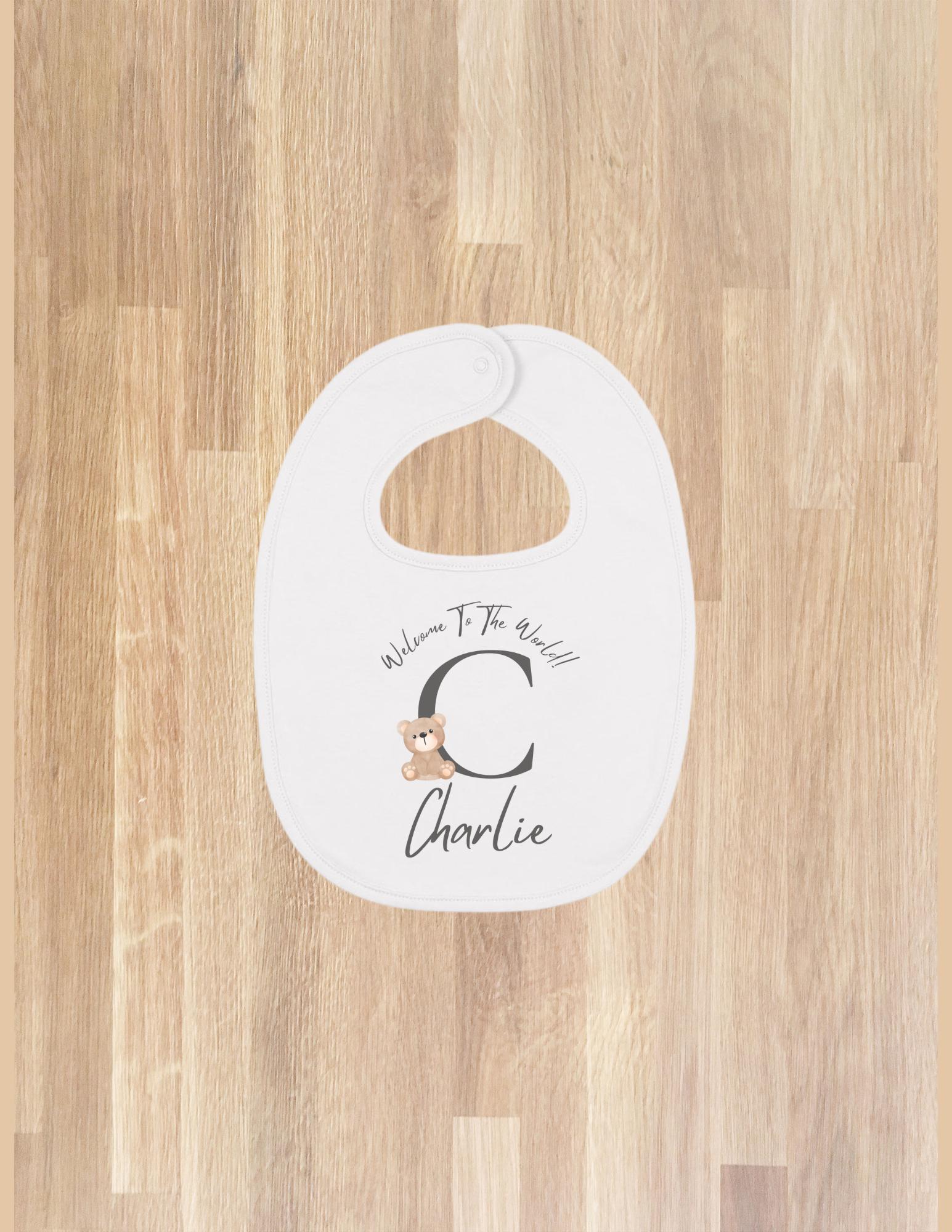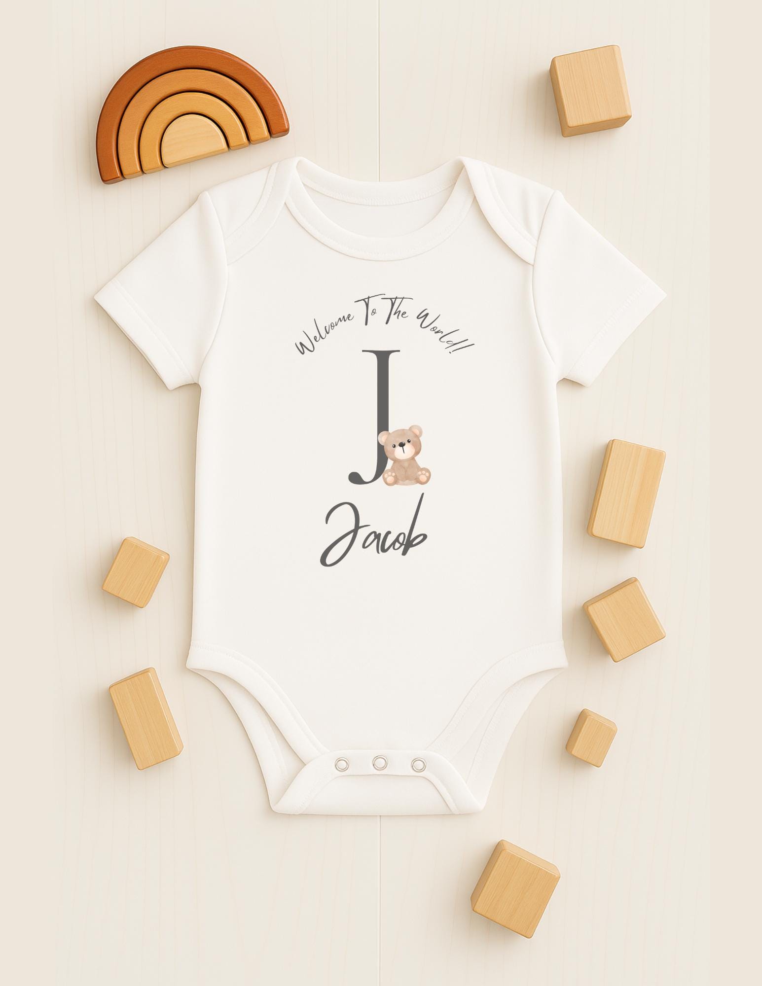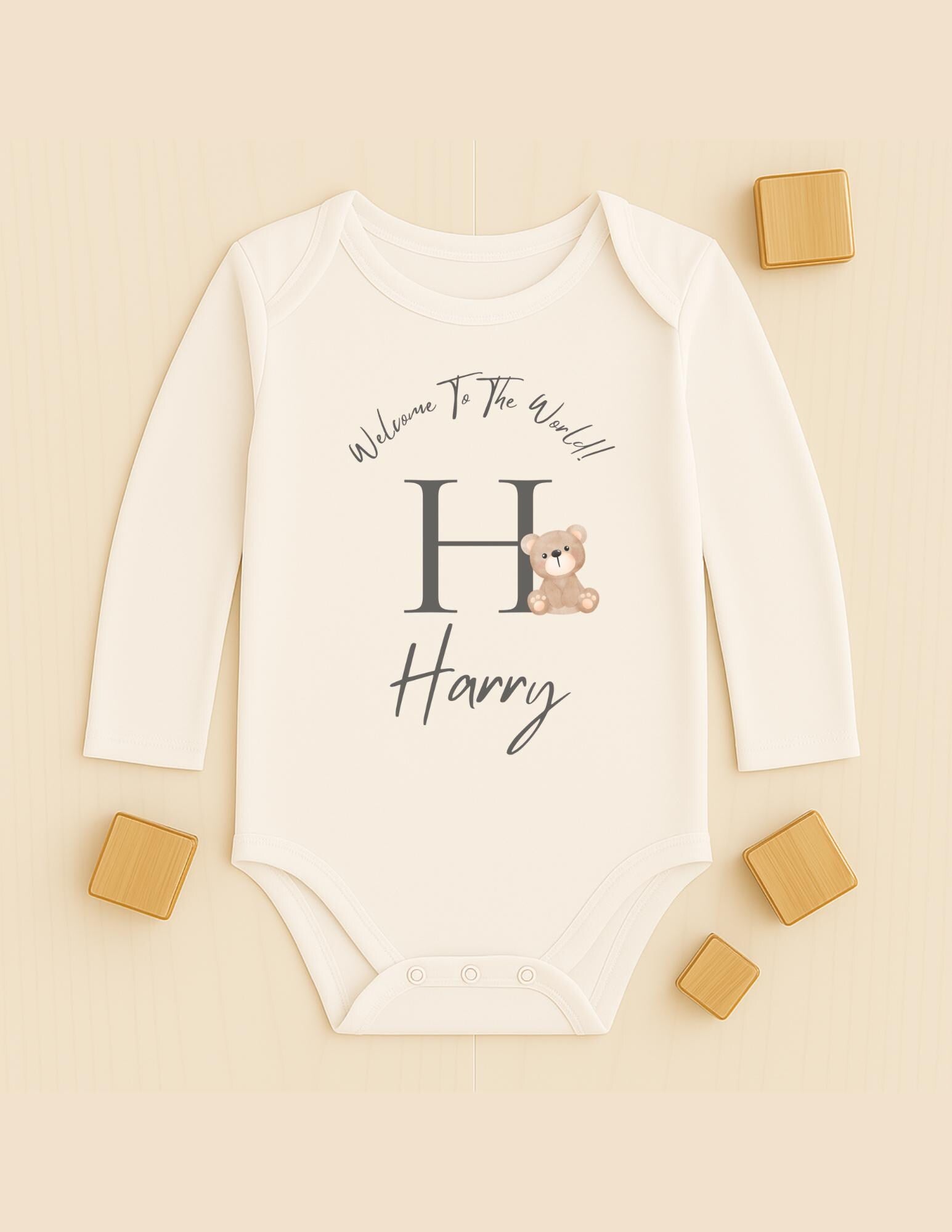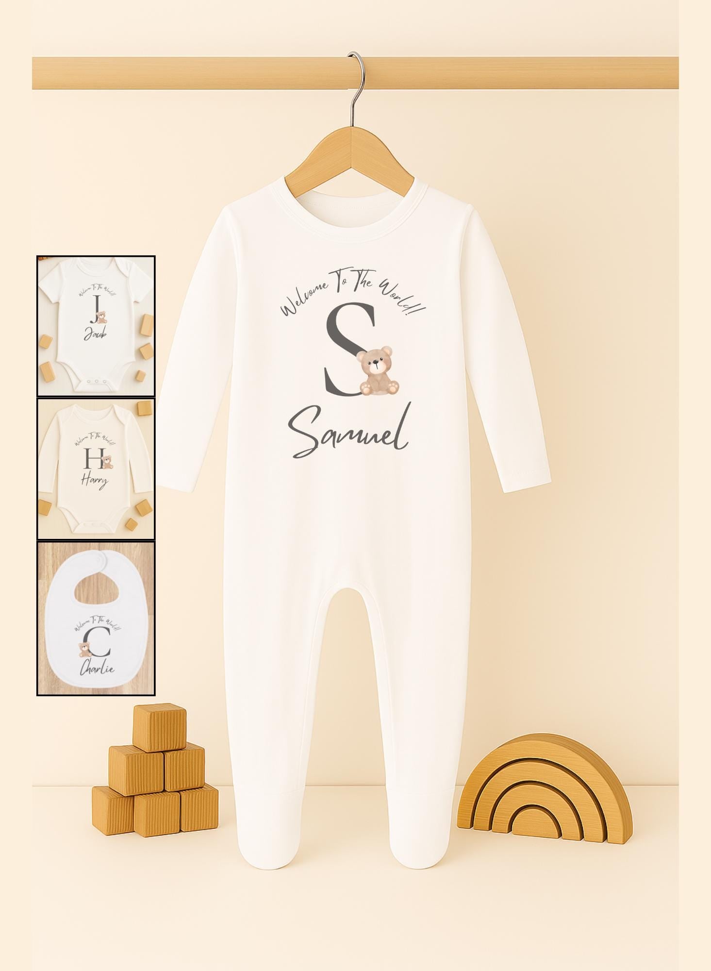 Personalised baby name bodysuit, Customisable baby name reveal sleep suit, Welcome to the world new baby vest, Baby bear grow gift
