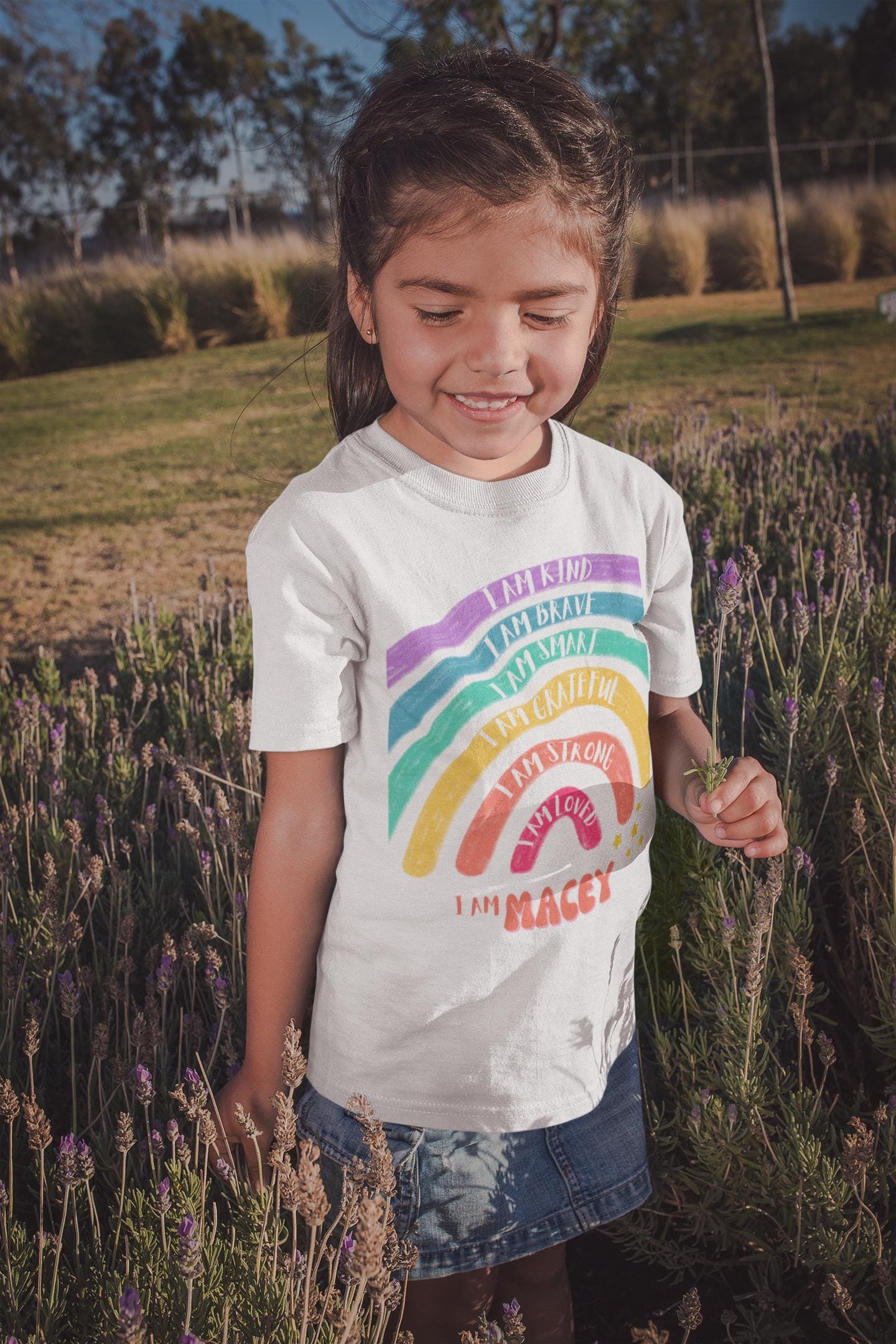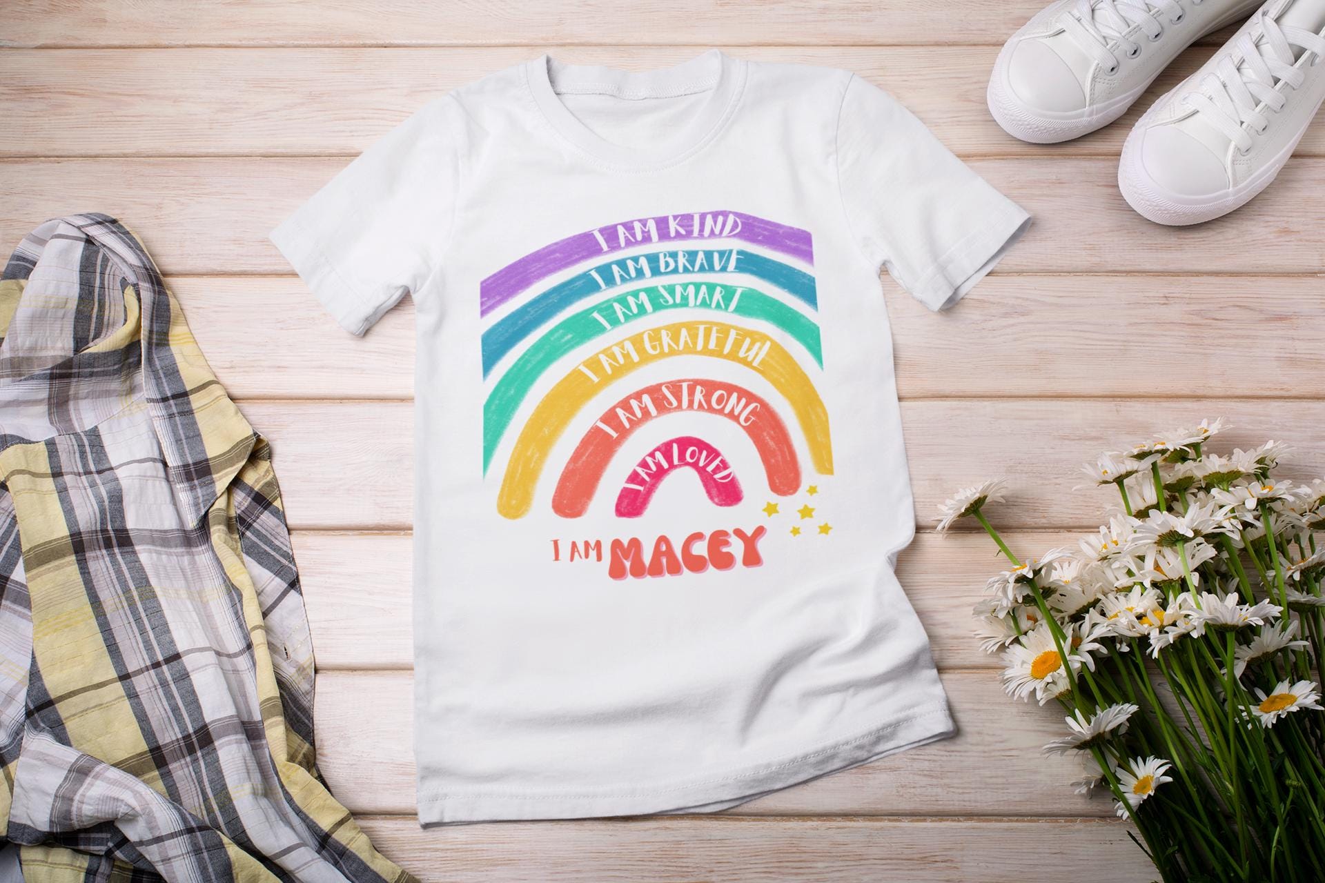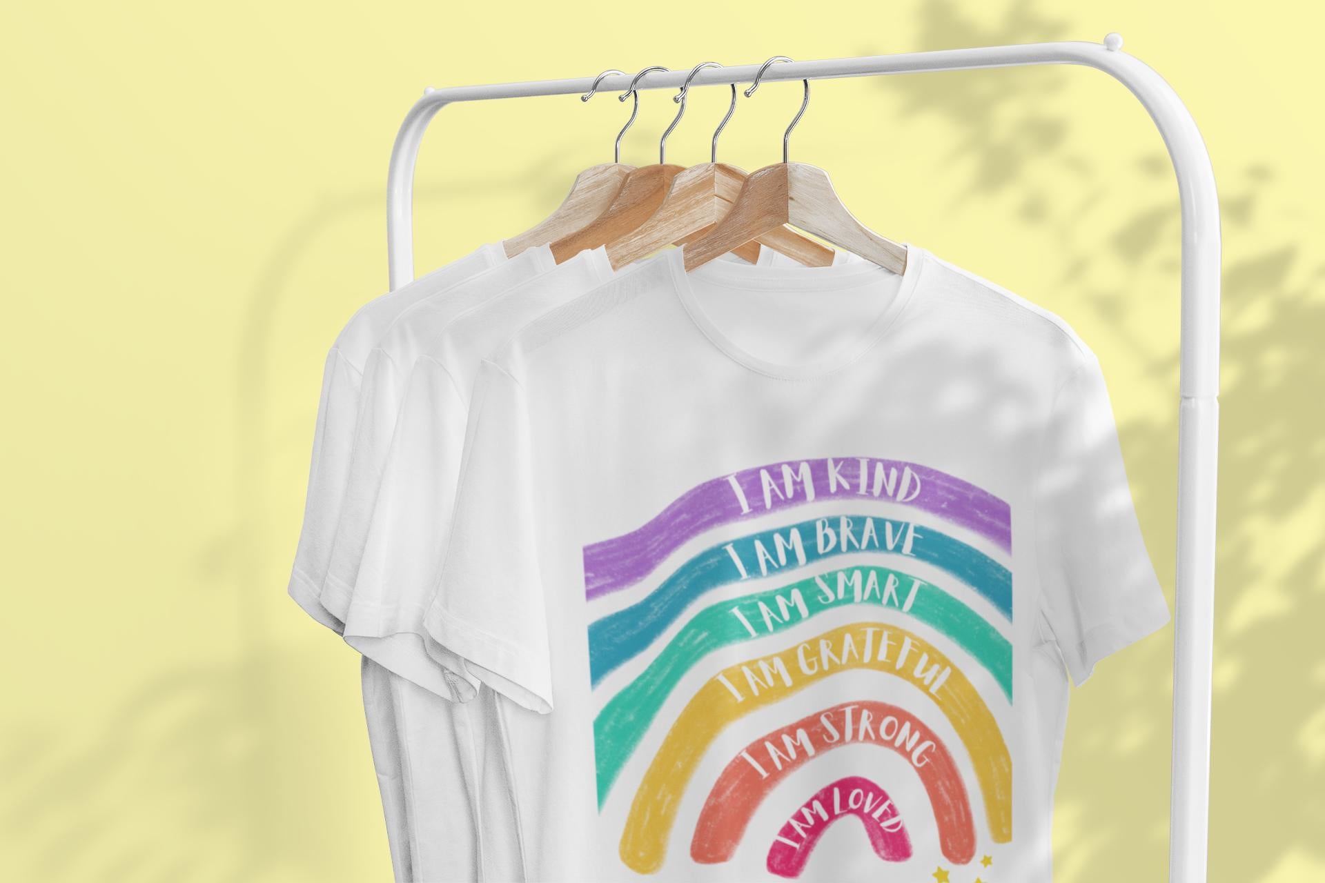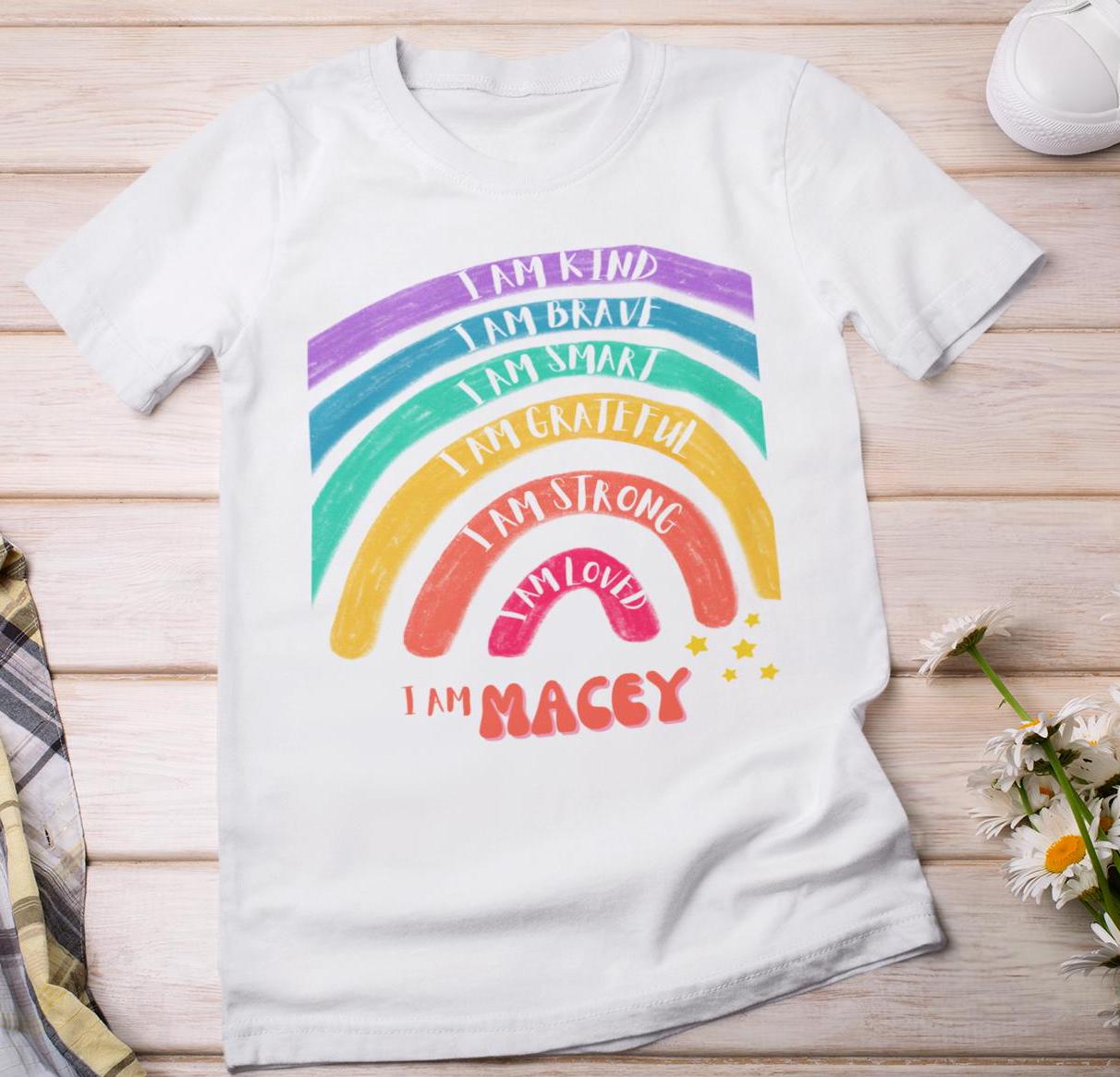 Personalised positive affirmations t-shirt - I am kind brave smart grateful strong loved - Inspirational Motivational Rainbow Print T-shirt