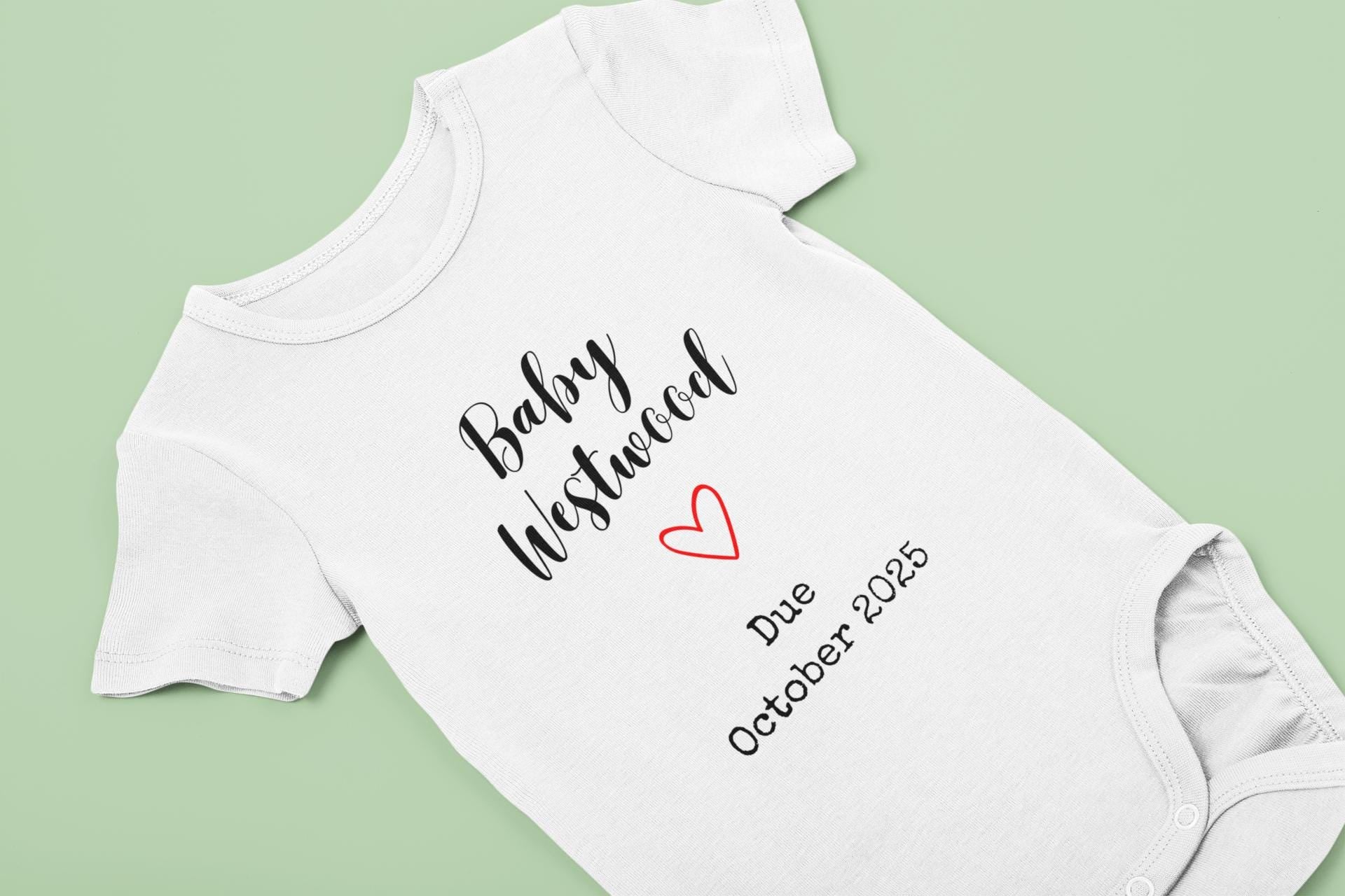 Celebrate and share the joy of your wonderful news with this heart-warming customised baby bodysuit! Featuring your baby's surname and due date, this adorable outfit is the perfect way to announce your little one's arrival to family and friends. Made from soft cotton fabric for your baby's comfort, this bodysuit isn’t just practical, it’s a charming keepsake to treasure forever. A special addition to your new baby's memory box, it beautifully captures the excitement of this unforgettable time. Whether for a heartfelt reveal or a precious memento, this personalised bodysuit is a lovely way to mark the beginning of your new baby's journey.