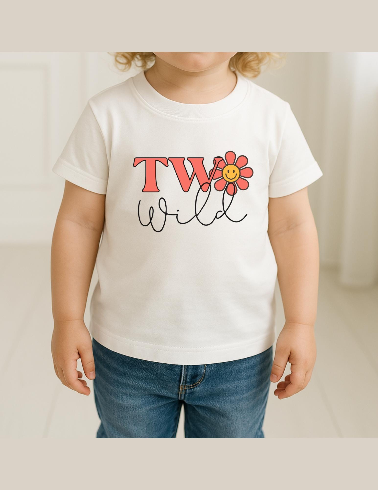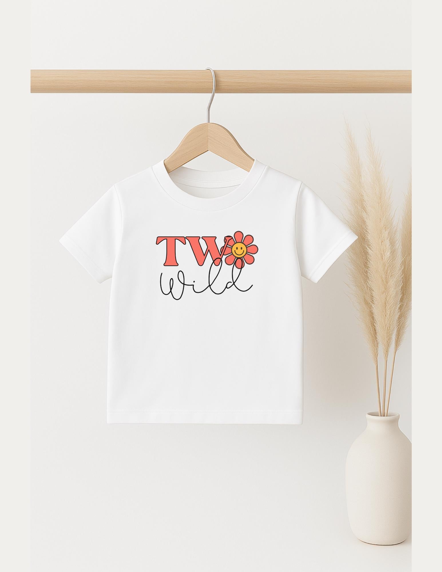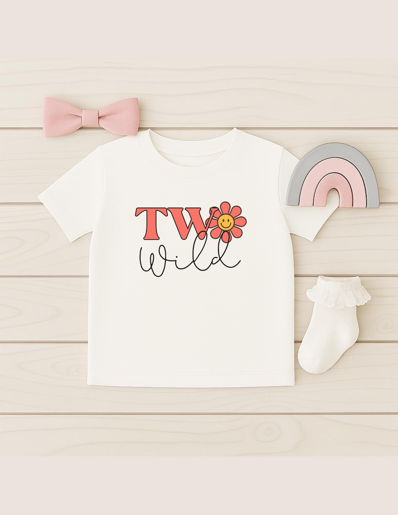 This features a playful "TWO Wild" print with a charming flower replacing the "O". This is classic white for a fresh, versatile look that pairs beautifully with any outfit.